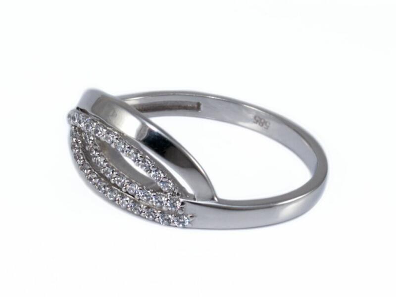 Modern stílusú, kedvelt fazonú, cirkónia kővel ékített, ródiummal bevont, áttört kialakítású, mutatós hullámos aranygyűrű.