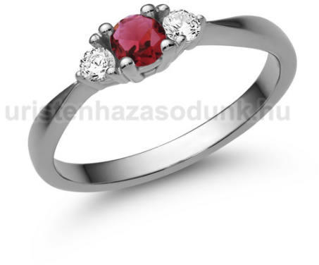 3 köves fehér arany eljegyzési gyűrű, rubin kővel középen és 2 darab gyémánt kővel oldalt.