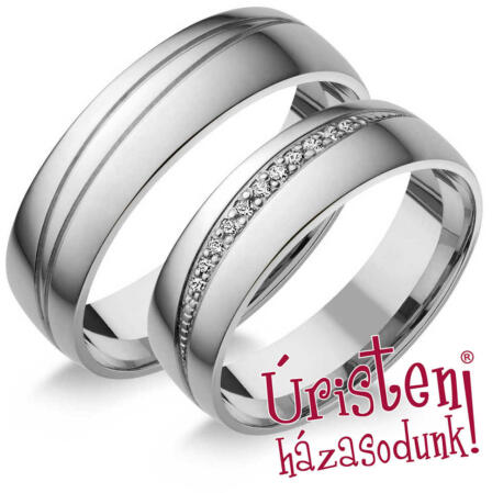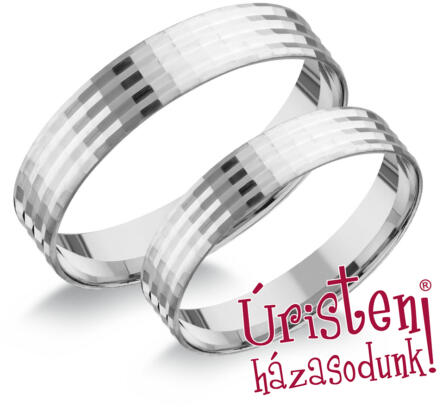 Modern, fehér arany karikagyűrű, lágy véséssel, fényes és matt felülettel. A női gyűrű 11 cirkónia kővel díszített.