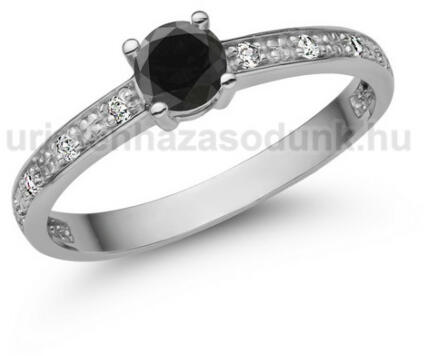 Fehér arany eljegyzési gyűrű 4-4 kísérő cirkónia kővel és egy nagy fekete gyémánt kővel középen.