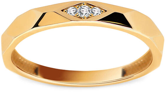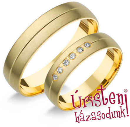 Modern, sárga arany karikagyűrű, szolid véséssel, matt és fényes felülettel. A női gyűrű 6 cirkónia kővel díszített.