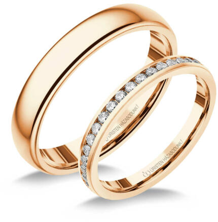 Klasszikus, rozé arany karikagyűrű, domború profillal. A női gyűrű cirkónia kövekkel díszítve.