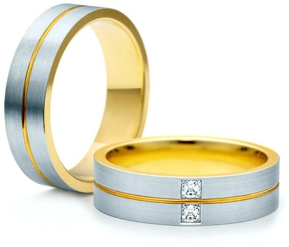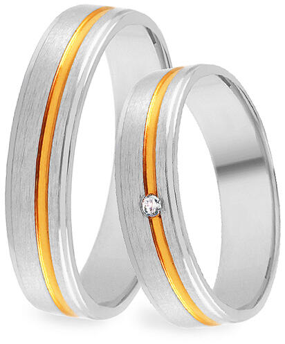 A kombinált, aranyból készült tökéletes jegygyűrűk szélessége 4 - 8 mm, a belső profiljuk enyhén domború, a kényelmesebb viselés érdekében. A külső profiljuk szintén enyhén domború. A dombornyomott peremvonalak fehér aranyból gyönyörű ellentétet alkotnak a sárga arany középső vékony sávval, amely magasfokú polírozással kezelt. A női gyűrűt ezen felül egy t