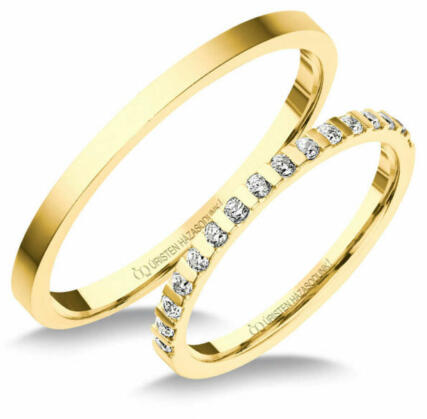 Vékony, klasszikus, sárga arany karikagyűrű. Fényes felülettel, a női gyűrű gyémánt kövekkel ékített.