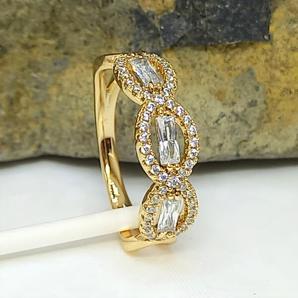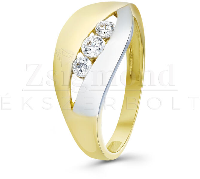 Aranyszínű gyűrű, kétféle csillogó fehér cirkónia kristály díszítéssel. A kristályok karmos foglalatban helyezkednek el. Időtálló darab, nem feketedik, mindennapi viseletre is alkalmas ("gold filled"). Antiallergén ékszer. 18K arany színben kapható. Az antiallergén ékszerek olyan fémötvözetből készülnek, melyek nem irritálják a bőrt, nem okoznak allergiás reakciók