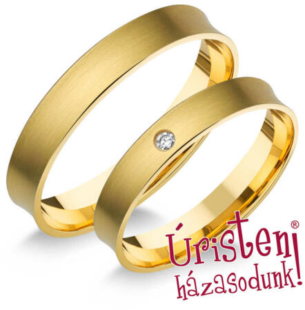 Modern, sárga arany karikagyűrű, homorú külső profillal és enyhén domború belső profillal, matt felülettel. A női gyűrűt 1 cirkónia kő díszíti.