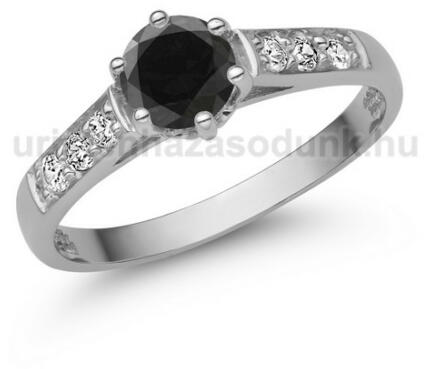 Modern, nőies fehér arany eljegyzési gyűrű 5 mm-es fekete gyémánt kővel középen és 3-3 gyémánt kővel oldalt.