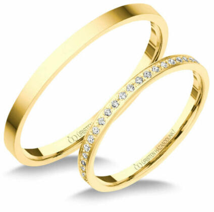 Elegáns, klasszikus, sárga arany karikagyűrű. 1.8 mm vékony sínnel, fényes felülettel, a női gyűrű gyémánt kövekkel ékített.