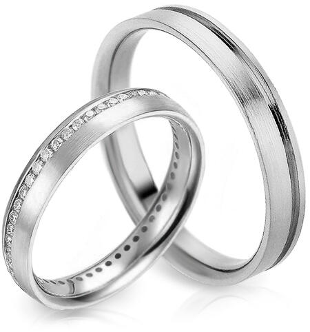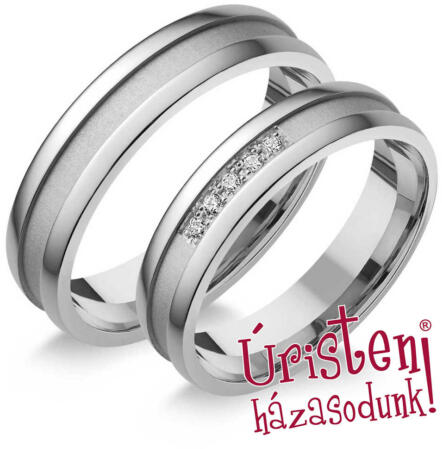 Fényes és matt felületű, fehér arany karikagyűrű, 5 mm széles sínnel, középen, matt bemarással. A női gyűrű 5 gyémánt kővel ékített.