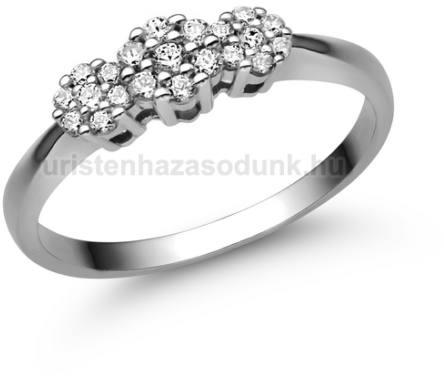 Különleges eljegyzési gyűrű, 21 darab cirkónia kővel, mely 3 virág formát alkot.