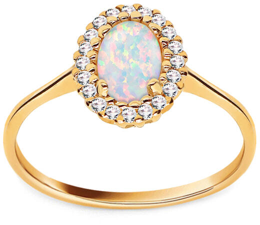 Elegáns gyűrű Angelina opállal 14 karátos sárga aranyból. A gyűrű ovális alakú, körös-körül csillogó cirkóniák díszítik, melynek közepét minőségi négyes foglalatban opál díszíti.