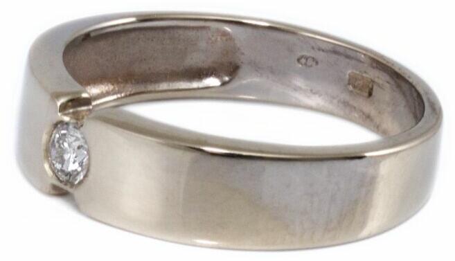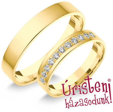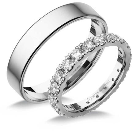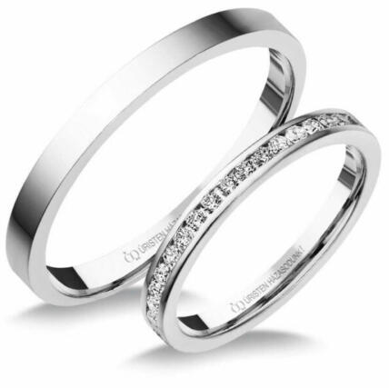 Hagyományos, vékony, fehér arany karikagyűrű. Lapos külső és enyhén domború belső profillal, a női gyűrű cirkónia kövekkel díszítve.