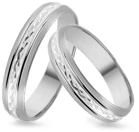 Fehér, aranyból készült jegygyűrűk, lekerekített profillal. Ezek a 4 - 8 mm széles karikagyűrűk belső lekerekített profillal rendelkeznek, a nagyobb kényelem érdekében. A gyűrűk központi dísze egy középső vonal, finom gravírozott mintával, amely a karikagyűrűk közepén halad keresztül, ahol a peremek fényesek. Amennyiben be szeretné gravíroztatni az esküvő dátumá