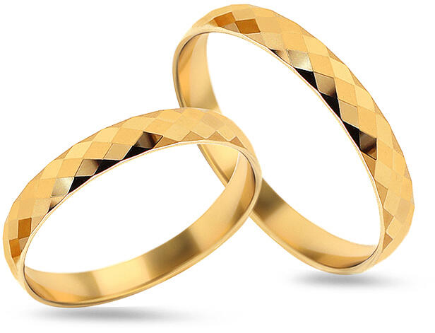 Modern arany esküvői gyűrűk mintagravírozással, szélessége 3 mm, modell SKOS006 Ezek a 3 mm szélességű modern jeggyűrűk sárga aranyból vannak elkészítve és kerekített profillal rendelkeznek. A gyűrűk centrális díszítését egy nem mindennapi minta és magas fenyesség kombinálja. A méretet külön-külön tudja kiválasztani - női és férfi méret is egyaránt. Név, d