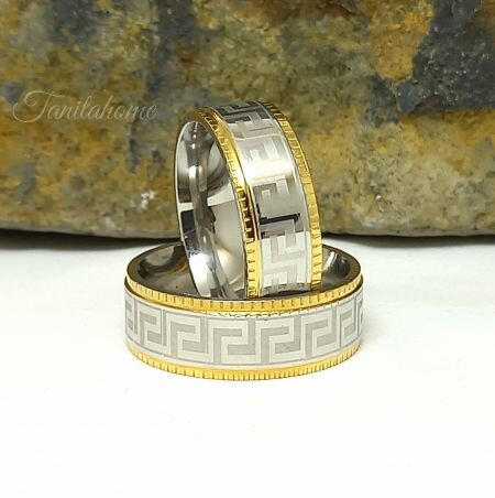 Ezüstszínű nemesacél (316L) gyűrű, oldalán végigfutó aranyszínű csíkkal. A gyűrű lézergravírozott görög minta díszíti. Tartós ékszer, nem karcolódik, nem feketedik, akár mindennapi viseletre is tökéletes. Antiallergén ékszer. Szélessége: 8 mm. 14K arany-ezüst színben kapható. A gyűrű belseje gravírozható. A nemesacél ékszerek rendkívül népszerűek kedvező