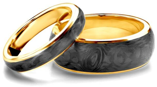 Esküvői karikagyűrűk: karbon és arany, félkör, 4 mm és 8 mm