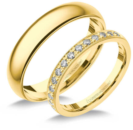 Sárga arany karikagyűrű, klasszikus stílusban, fényes felülettel. A női gyűrű cirkónia kövekkel díszített.