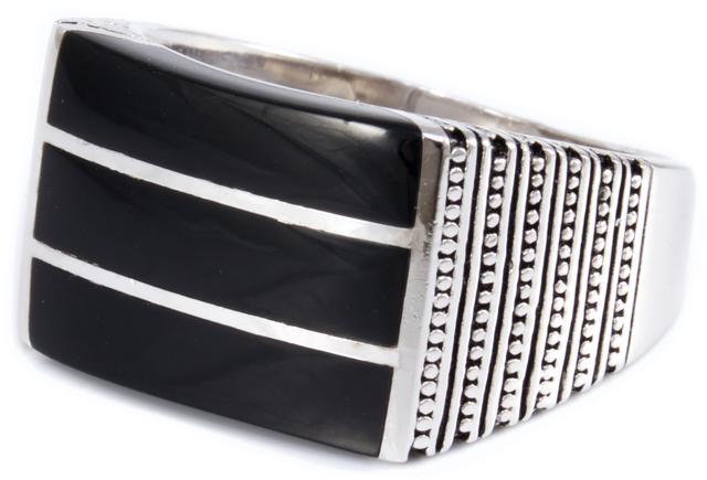 Modern stílusú, kedvelt fazonú, ródiummal bevont, fekete kövel ékített, szögletes férfi ezüst pecsétgyűrű.