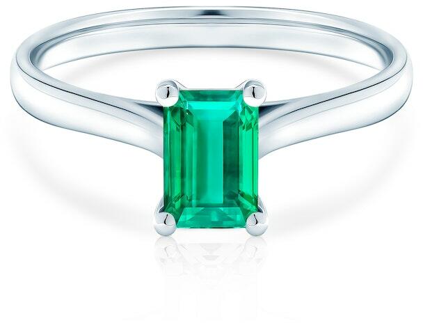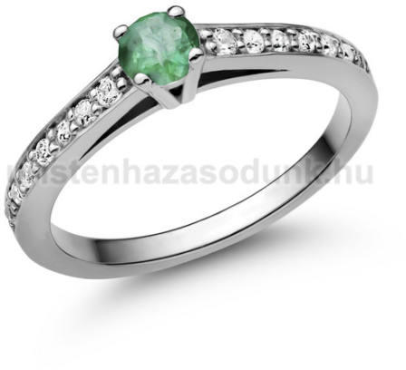 Elegáns fehér arany eljegyzési gyűrű, smaragd kővel és több cirkónia kővel oldalt.