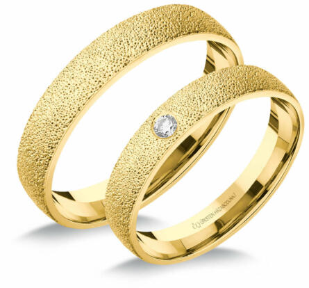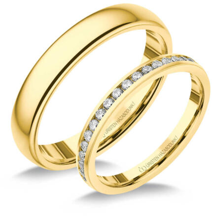 Klasszikus, sárga arany karikagyűrű, domború profillal. A női gyűrű gyémánt kövekkel ékített.