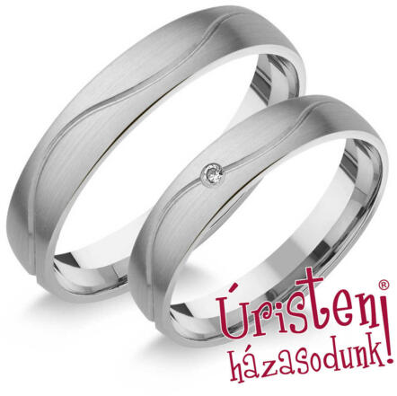 Fehér arany karikagyűrű, hullámos véséssel, kívül-belül enyhén domború profillal. A női gyűrű cirkónia kővel díszített.