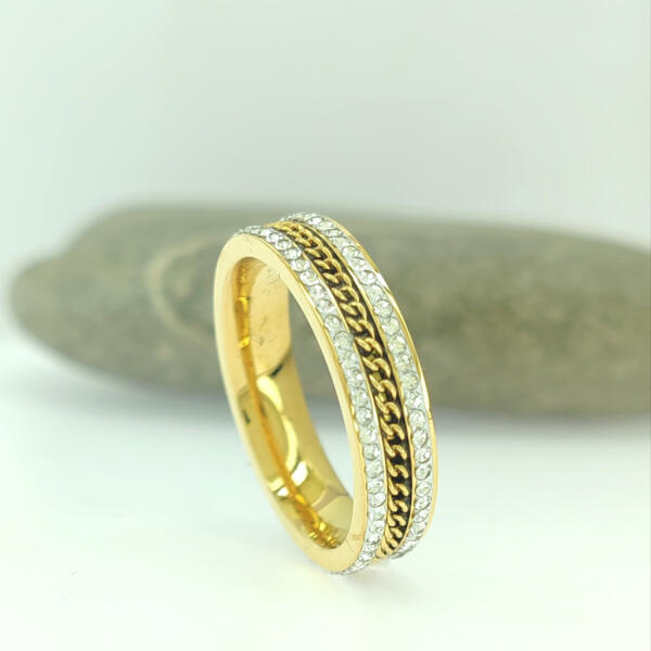 Aranyszínű nemesacél ( 316L ) gyűrű, melyet csillogó fehér cirkónia kristályok díszítenek. A kristályok a gyűrű két szélén helyezkednek el, a közepén áttört minta húzódik végig. A kristályok ragasztott foglalatban helyezkednek el. Időtálló darab, nem feketedik, mindennapi viseletre is alkalmas. Antiallergén ékszer. 14K arany színben kapható. Gyűrű szélessége: 5