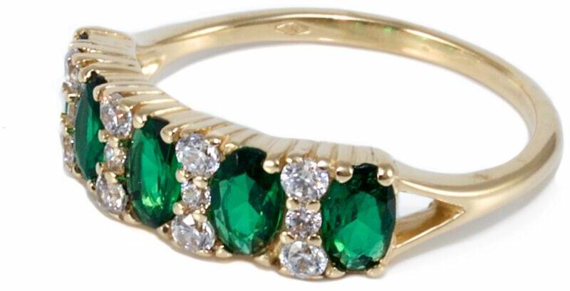 Igen mutatós, zöld színű műtermékkel és cirkónia kövekkel díszített arany eljegyzési gyűrű.