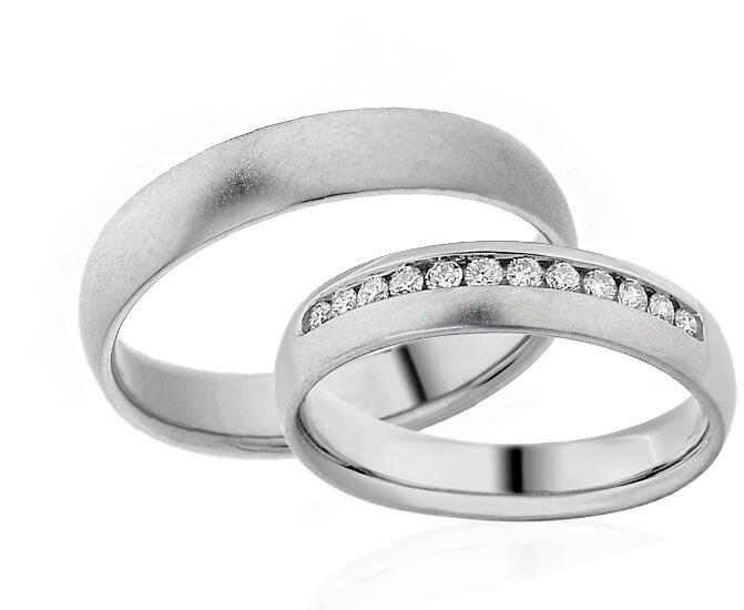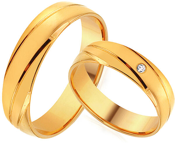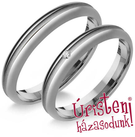 Domború, fehér arany karikagyűrű, fényes és matt felülettel, körbe vésett. A női gyűrű 1 gyémánt kővel ékített.