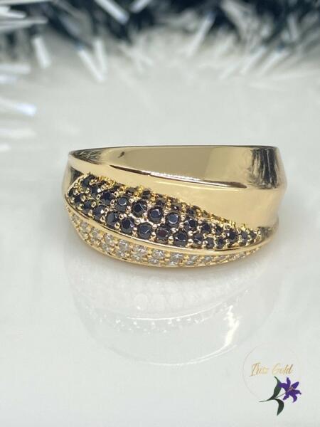 Gyünyörű kialakitású gyűrű, fekete, fehér cirkónia kövekkel diszitve Szin: 18K Szélesség. 14 mm A forgalmazott divatékszerek alapanyaga nikkel és ólommentes ezért többnyire nem okoznak allergiás tüneteket, nyugodtan hordhatják fémérzékeny emberek is. Általában nem színezik a bőrt és más divatékszerekhez képest nagyságrendekkel jobb kopásállósággal rendelkeznek.