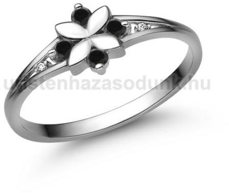 Virág formájú eljegyzési gyűrű, körben fekete gyémánt kövekkel és 1-1 gyémánt kővel oldalt.