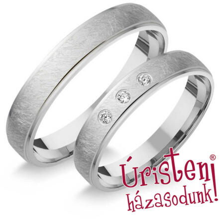 Selyemfényű, fehér arany karikagyűrű, 4 mm széles sínnel, oldala fényes felületű. A női gyűrűt 3 gyémánt kő ékíti.