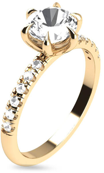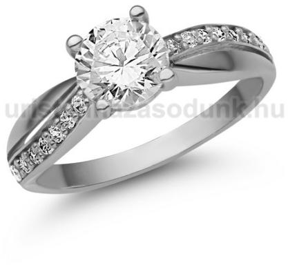 Nagy köves eljegyzési gyűrű, 6 mm átmérőjű cirkóna kővel középen és további 18 darab cirkónia kővel aszimmetrikus elhelyezkedésben.