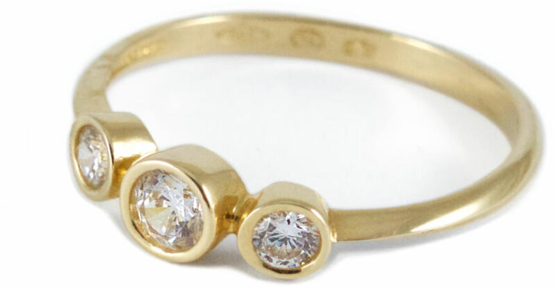 Sárga arany modern, letisztult kialakítású, középen három cirkónia kővel díszített női gyűrű.