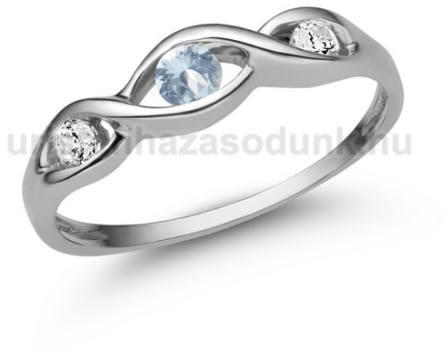 Csavart formájú, 3 köves eljegyzési gyűrű, finom, csavart foglalatban akvamarin kővel és gyémánt kövekkel.