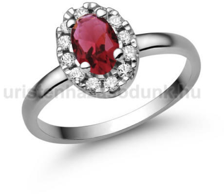 Különleges eljegyzési gyűrű, ovális nagy rubin kővel és több kisebb gyémánt kővel.