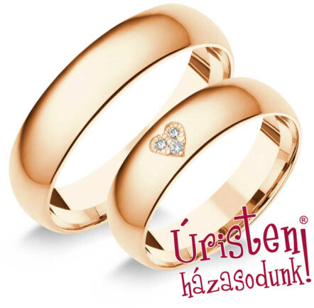 Kézzel készített, klasszikus, rozé arany karikagyűrű, domború profillal, 3 gyémánt kővel ékítve, szív alakú foglalatban.