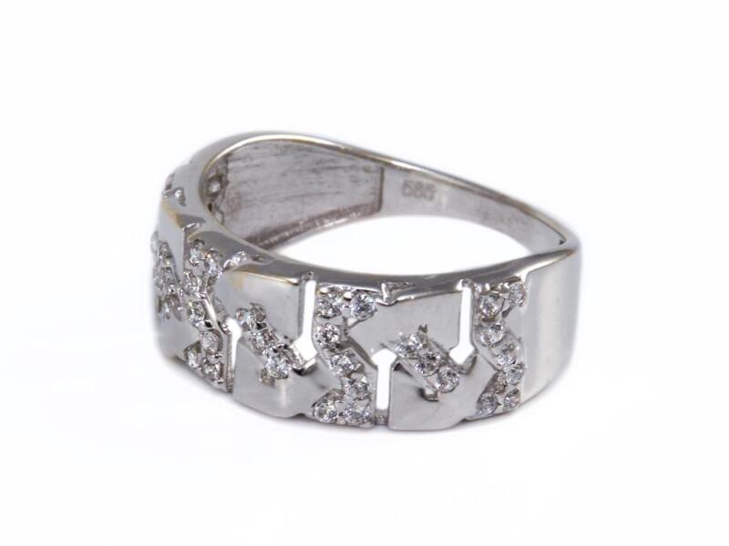 Modern stílusú, különleges és mutatós, áttört fejrészén hullám vonalban cirkónia kövekkel ékített, ródiummal bevont masszív arany gyűrű.