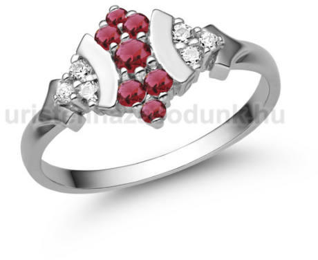 Modern formavilágú eljegyzési gyűrű, 7 darab briliáns csiszolású rubin kővel és 6 darab gyémánt kővel.