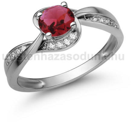 Különleges, csavart formájú eljegyzési gyűrű, rubin kővel középen, 16 darab gyémánt kővel oldalt.