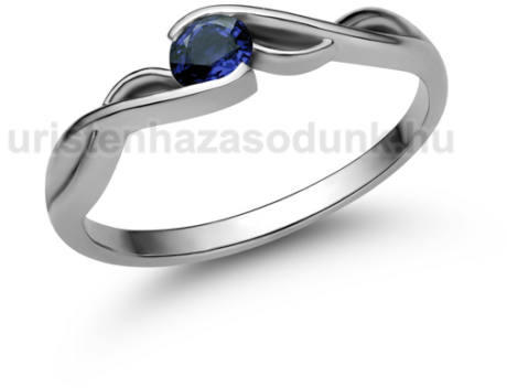 Praktikus viselésű eljegyzési gyűrű, csavart foglalattal, kék zafír kővel a közepén.