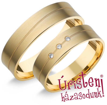 Modern, sárga arany karikagyűrű, lágy véséssel, lapos külső profillal és enyhén domború belső profillal. A női gyűrűt 3 gyémánt kő ékíti.