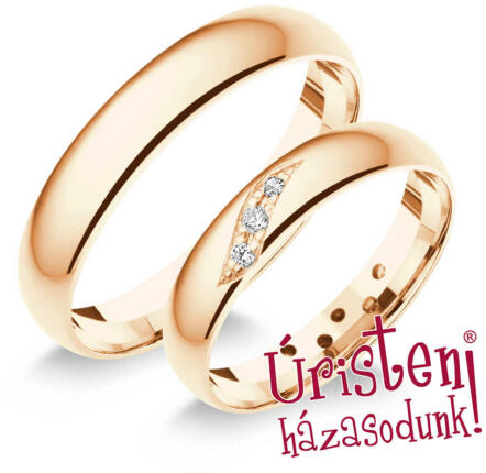 Hagyományos, rozé arany karikagyűrűk. Kézzel készítve, 3 gyémánt kővel ékítve, különleges foglalatban.