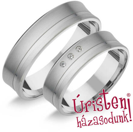 Modern, fehér arany karikagyűrű, enyhén homorú külső profillal és kényelmes, enyhén domború belső profillal. A női gyűrűt 3 gyémánt kő ékíti.