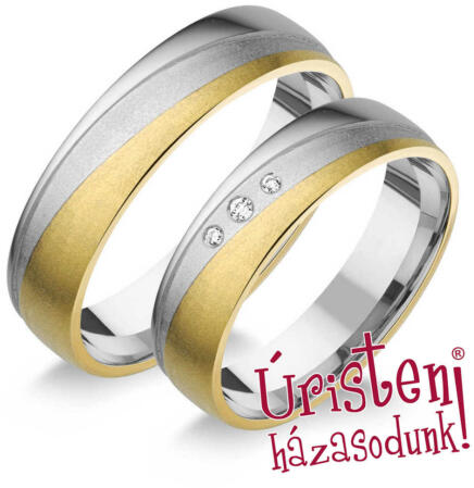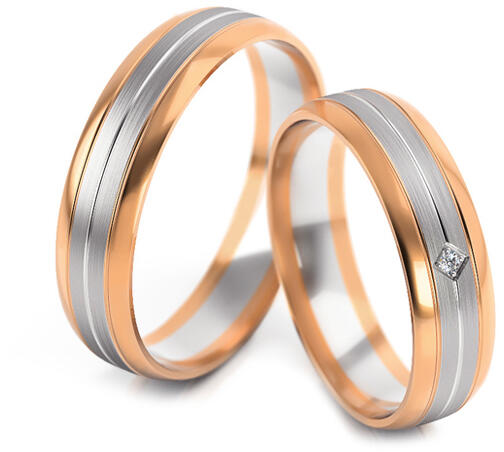 Többszínű, 14 karátos aranyból készült jegygyűrűk. Ezek az 5 mm széles karikagyűrűk belső lekerekített profillal rendelkeznek a nagyobb kényelem érdekében. A gyűrűk központi dísze egy fehér arany vonal, egy káprázatos gyémánttal díszítve: 0,015 ct, magasfokúan polírozott, rózsaszín arany peremekkel. A jegygyűrűk méretét külön-külön választhatja ki - a női