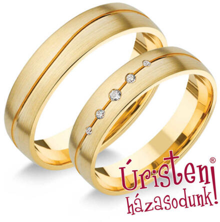 Hullámos véséssel díszített, sárga arany karikagyűrű, matt felülettel, enyhén domború külső-belső profillal. A női gyűrűt 5 cirkónia kő díszíti.