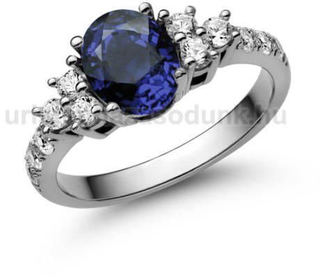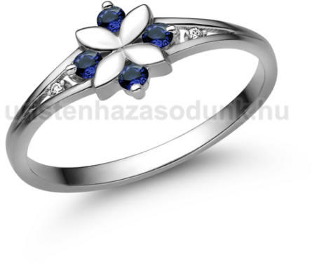 Virág formájú eljegyzési gyűrű, körben kék zafír kövekkel és 1-1 gyémánt kővel oldalt.