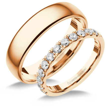 Klasszikus, rozé arany karikagyűrű, fényes felülettel és kívül-belül enyhén domború profillal. A női gyűrű gyémánt kövekkel ékített.