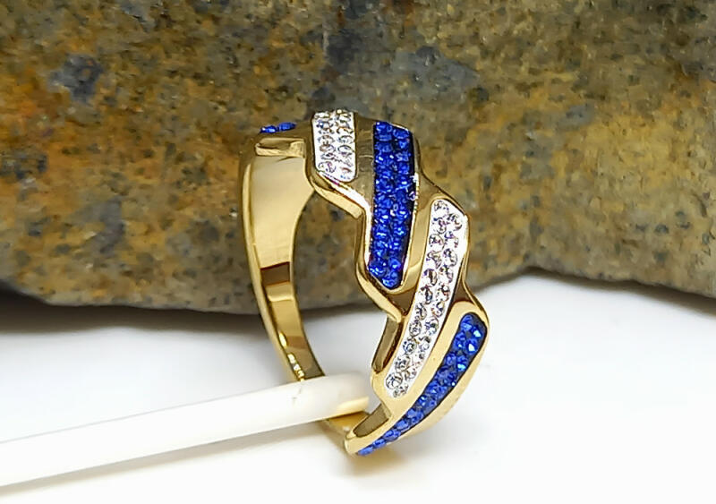 Aranyszínű nemesacél ( 316L ) gyűrű fehér és királykék cirkónia kristály díszítéssel. A kristályok ragasztott foglalatban helyezkednek el. Időtálló darab, nem feketedik, mindennapi viseletre is alkalmas. Antiallergén ékszer. 14K arany színben kapható. A nemesacél ékszerek rendkívül népszerűek kedvező tulajdonságaik miatt. A nemesacél semmilyen nikkelsót nem bocsájt