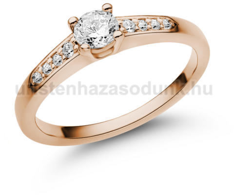 Sikkes, rozé arany eljegyzési gyűrű, középen 0.30 ct-os, briliáns csiszolású gyémánt kővel és további 8 gyémánt kővel oldalt.