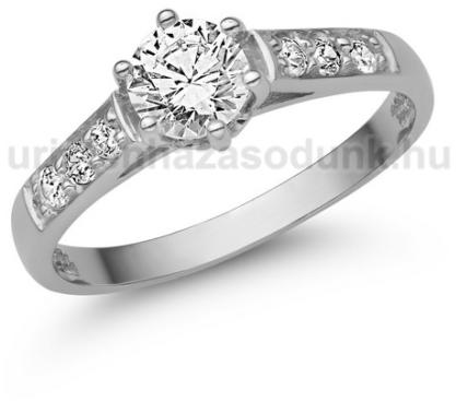 Modern, nőies fehér arany eljegyzési gyűrű 5 mm-es cirkónia kővel középen és 3-3 cirkónia kővel oldalt.
